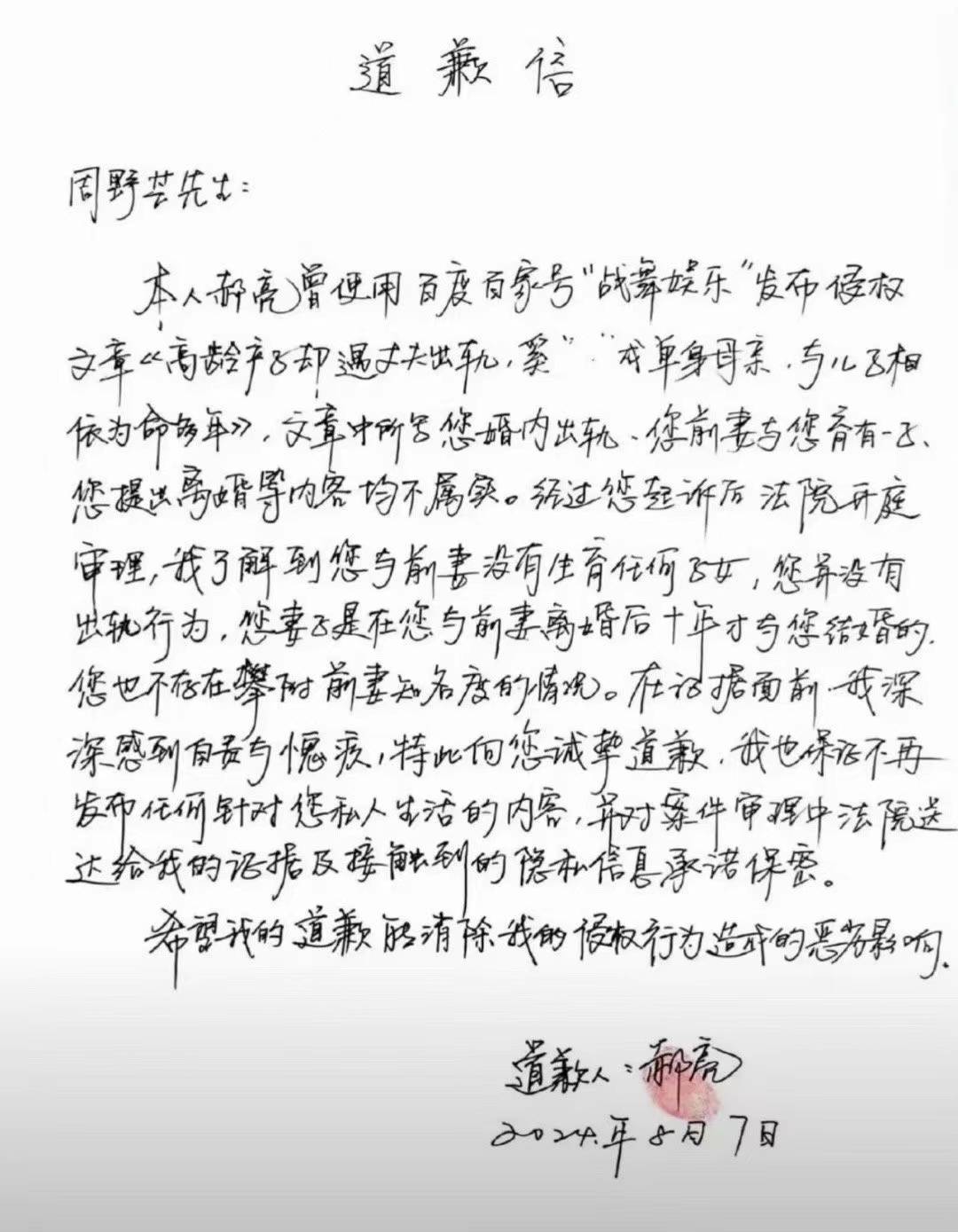 这道歉信是写给周野芒的,因为自媒体作者写了周野芒《高龄产子却遇丈夫出轨,奚美娟成单身母亲与儿子相依为命多年》,文章中写周老师婚内出轨,与前妻奚美娟育有一子都不是真实的。周野芒起诉对方后开庭审理,周野芒与前妻奚美娟没有生育任何子女,也没有出轨行为,周野芒和奚美娟离婚十年后才再婚。