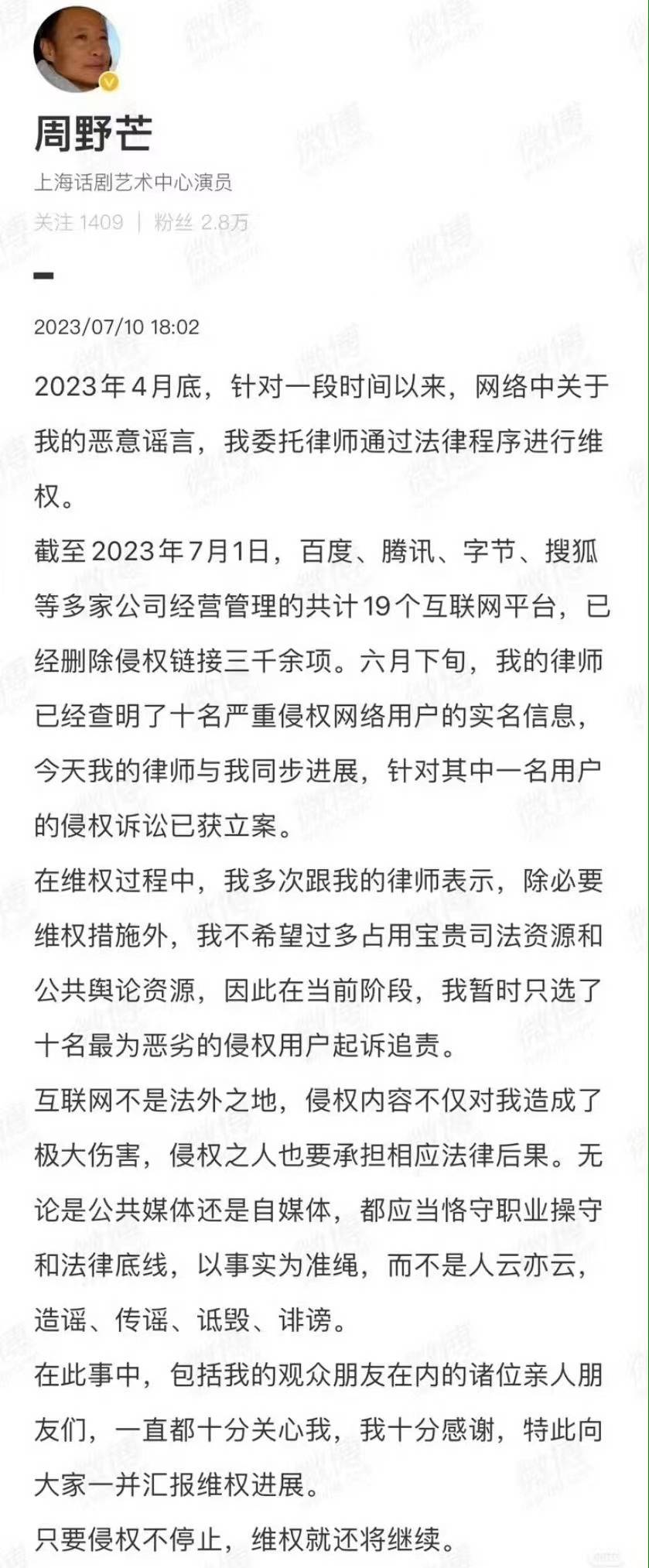 据悉2023年起诉造谣者并胜诉,累计删除侵权链条超3000条,十余名博主公开向周野芒道歉。